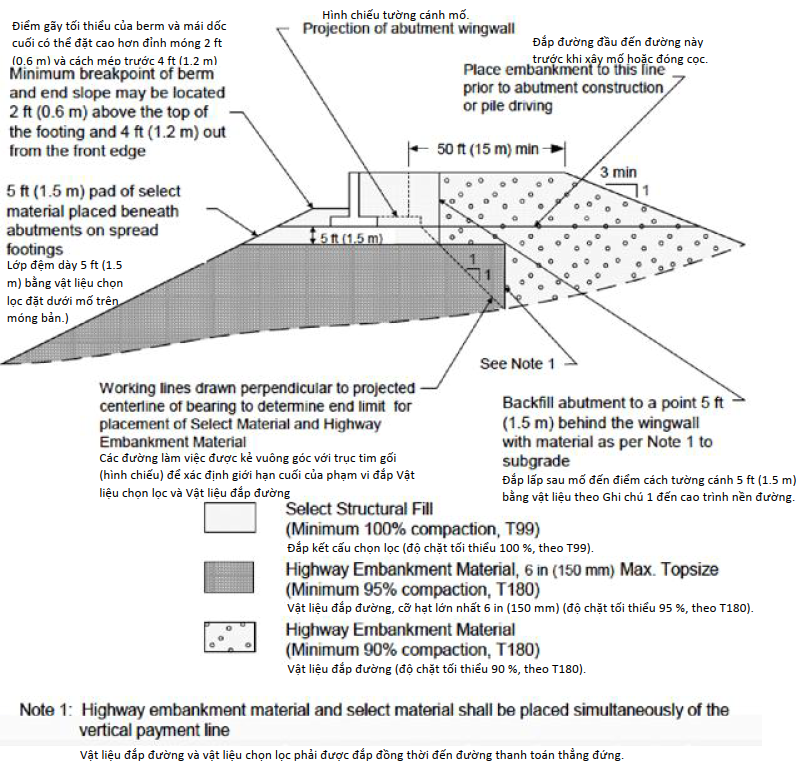 Khi thi công lớp đắp có kết cấu (structural fill) đầm chặt để đỡ móng cầu như mố cầu, cần có các chi tiết và chỉ dẫn kỹ thuật riêng. Hình 1 thể hiện các chi tiết khuyến nghị cho việc xây dựng đường đầu cầu và móng cầu bằng structural fill. Các chỉ tiêu vật liệu được lựa chọn sao cho lớp engineered fill có thể được đầm chặt đến trạng thái chặt, không biến dạng để đỡ spread footing mố cầu. Geotechnical Engineering Circular No. 6: Shallow Foundations của FHWA khuyến cáo rằng vật liệu đắp kết cấu cho đường đắp đường bộ không được chứa các loại vật liệu không phù hợp hoặc có hại như than bùn, bùn hữu cơ, gỗ, rác hữu cơ, than đá, than củi hoặc bất kỳ vật liệu nào khác có khả năng làm việc kém trong khối đắp.(12)
